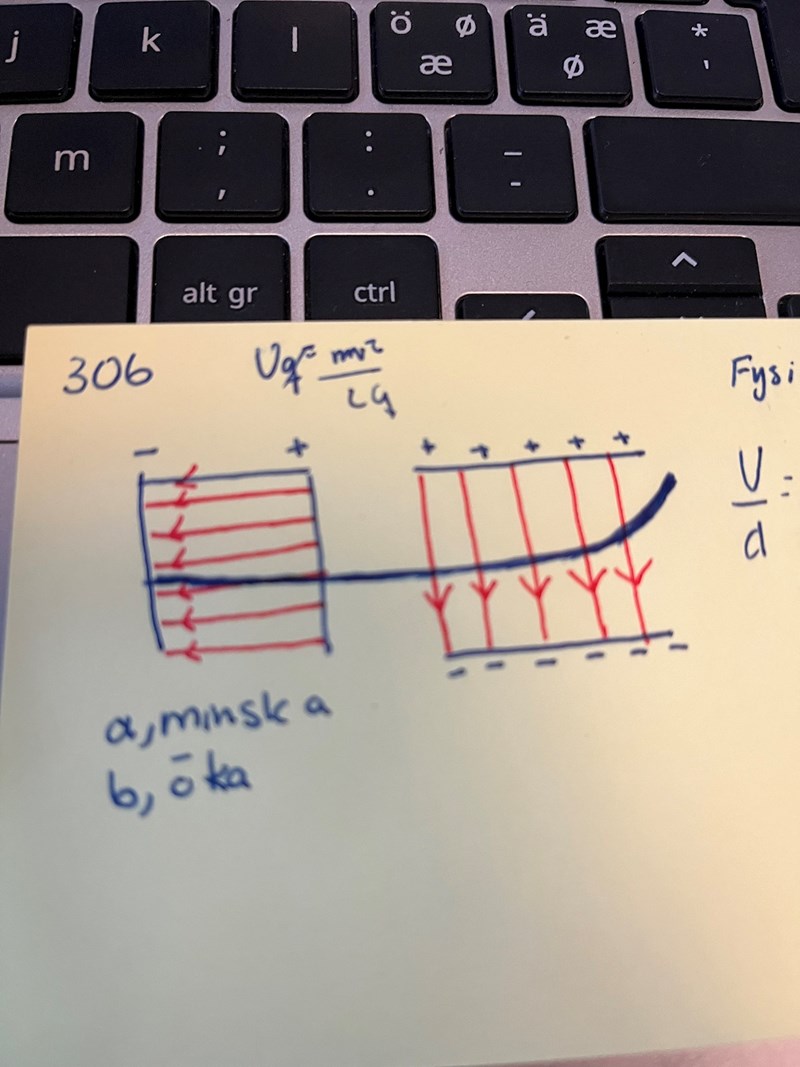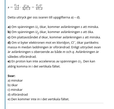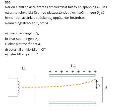 Hej, på e, varför kan inte en proton komma in i det vertikala fältet? Eller lättare sagt varför kan den inte accelereras av spänningen U1? Vi hade genomgång på denna uppgift och då sa läraren att förändringen är bara att protonen åker åt motsatt håll än elektronen. Så jag förstår inget just nu.