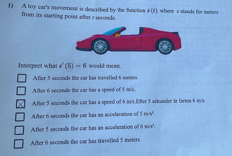 6 står för hastigheten m/s och eftersom hastigheten är konstant och innebär att bilen kör 6 m på en sekund då är det endast den kryssade rutan som stämmer.