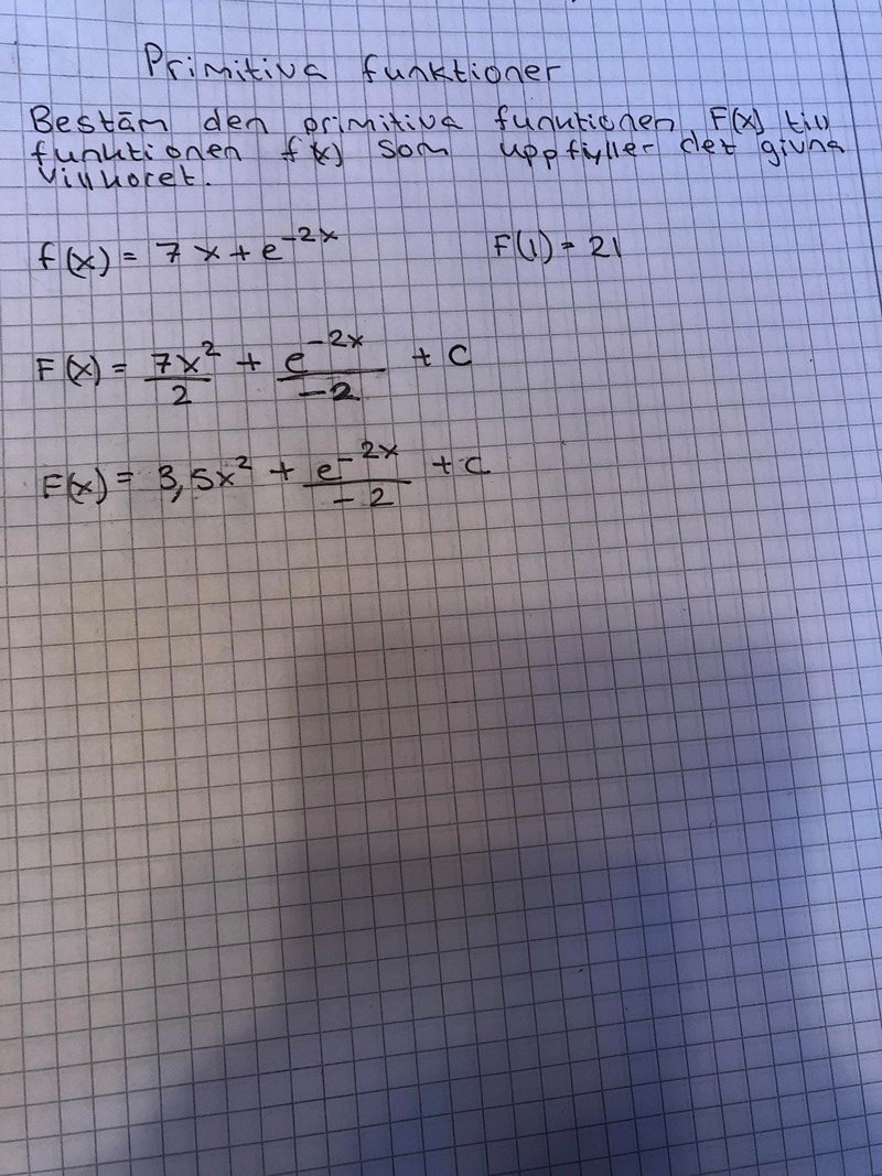 Du vet att F(1)=21 så sätt in F(1)=21 och x=1 i uttrycket för F(x) och räkna fram C.
