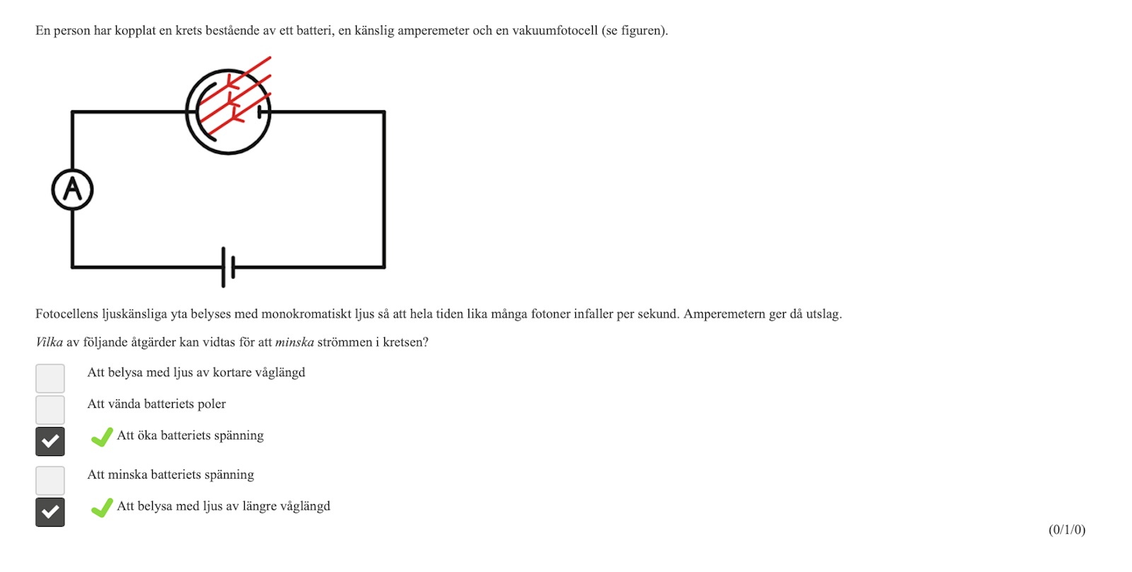- Motivering 2: Om batteriet är kopplat enligt ovan kommer den högra sidan av fotocellen bli negativ och den vänstra bli positiv. Om strömstyrkan ökar kommer även det elektriska fältet över fotocellens att öka enligt sambandet E = U/d. Om det elektriska fältet ökar kommer elektronerna ha svårare att ta sig till anoden => strömstyrkan minskar.