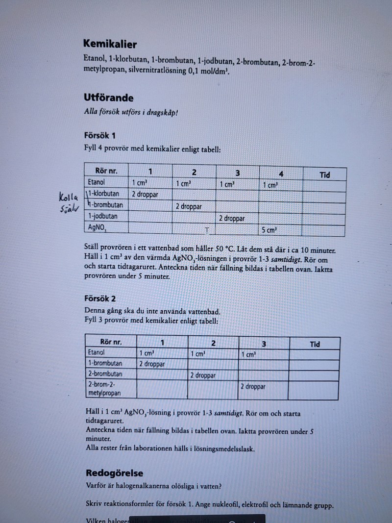 Jag försöker förstå vad som sker i en substitutionsmetod av halogenalkaner i etanol där silvernitrat tillsäts (1-klorbutan, 1-brombutan och 1-jodbutan samt för bromalkanerna; 2-bromalkan och 2-brom-etyl-propan). Jag tror jag förstår hur både Sn1 och Sn2 fungerar fast det jag inte förstår är varför jodbutan bildar en fällning snabbare än klorbutan, varför brombutan inte bildar en fällning och varför 2-brombutan gör det. Så här ser labratonen ut: