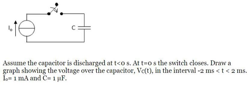 Det är två fall: t<0 och t>0. När fallet t<0 gäller, alltså innan switchen stänger vid t = 0 så är spänningen över kapacitatorn 0 V, detta på grund av att ingen ström flyter igenom kretsen och således är det inte spänning över kapacitatorn. Så mellan -2 ms och 0 ms så är spänningen 0 V.