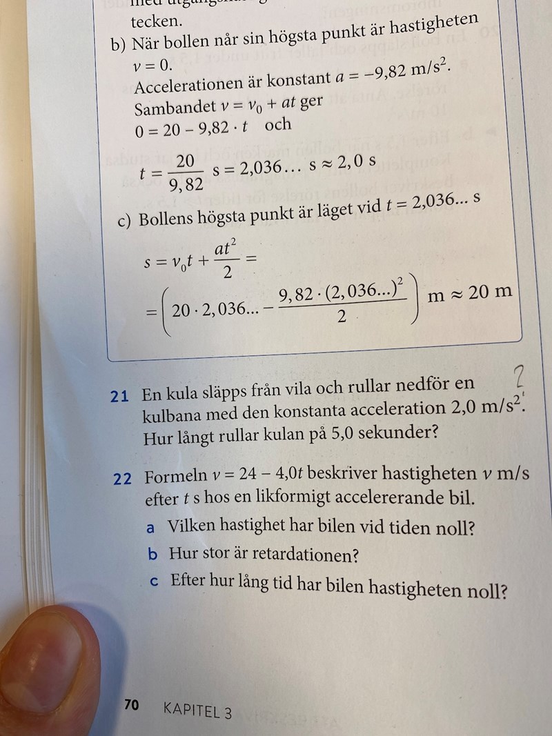 Kulan släpps från vila, dvs v0=0. Sedan har den konstant acceleration.