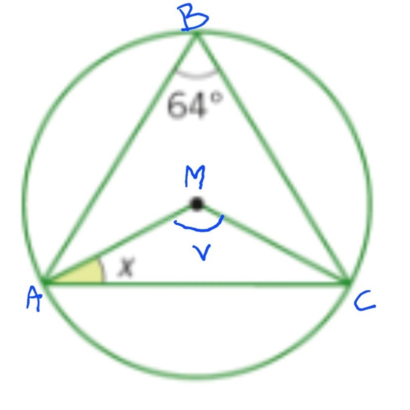 Om M är cirkelns medelpunkt så kan du berökna vinkeln v med hjälp av randvinkelsatsen.