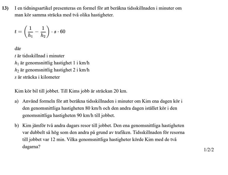Jag har sedan gjort om en av dessa h2 till h och kallat den andra för 2h, vilket gjort att jag fått svaret 1/h= 0.01 alltså h = 100 km/h, vilket är det korrekta svaret.