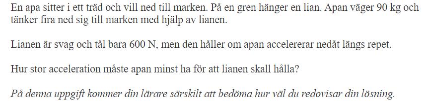Som frågan nedanför visar så måste man bestämma accelerationen av apan så att lianen inte går sönder fast oavsett hur jag gör så får jag fel svar. Jag testade först med att göra 600=9.82*90-90*x och så fick jag ungefär 3.1m/s^2 fast det visade sig vara fel. Är det inte så att den man ska subtrahera tyngdkraften med den resulterande kraften eftersom annars hade tyngdkraften varit för stor och då hade lianen gått sönder. Tack i förväg!