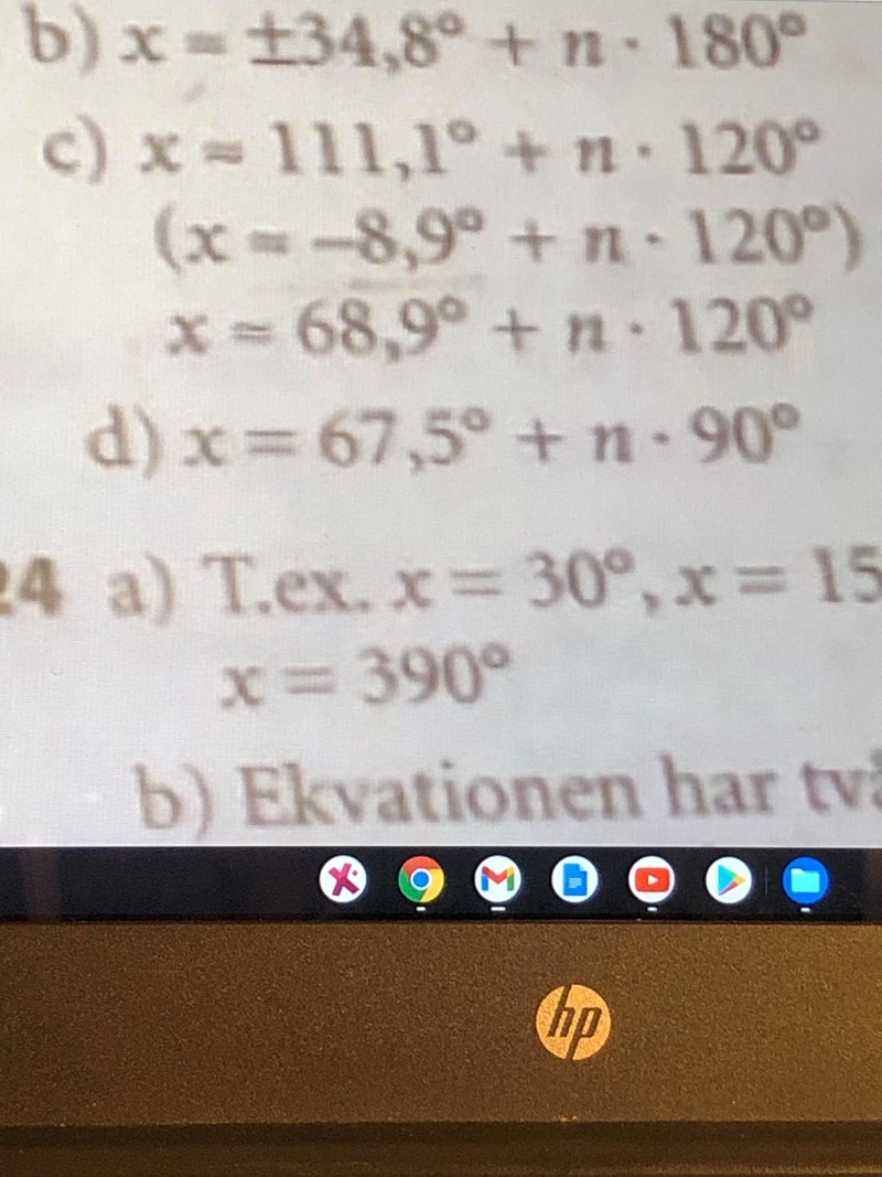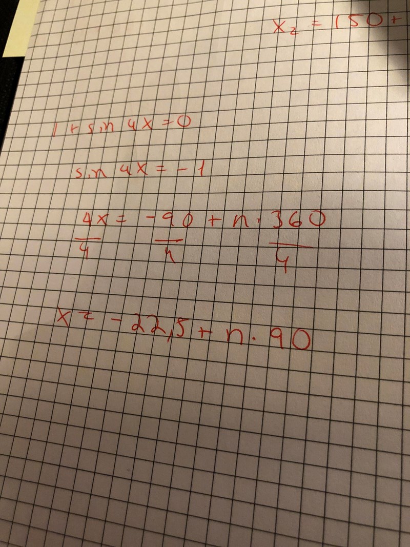 Det du alltid bör göra är att kontrollera att ditt svar verkar stämma, dvs att du väljer ett par värden på n, beräknar vinkeln x och sätter in det värdet i ekvationen för att se om den stämmer.