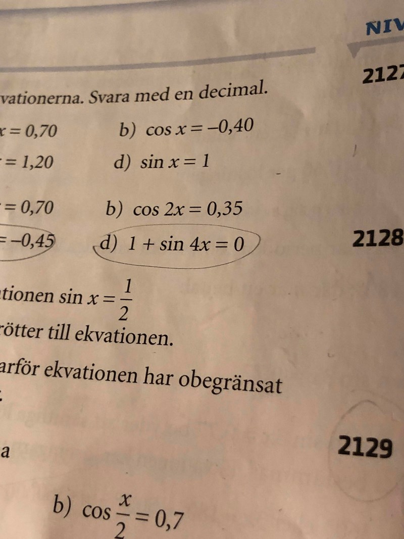 Metod 2, Med hjälp av "180° minus vinkeln" som vanligt: Ekvationen sin(v) = -1 har lösningarna v1 = -90° + n•360° och v2 = 180° - (-90°) + n•360°, dvs v2 = 270° + n•360°.