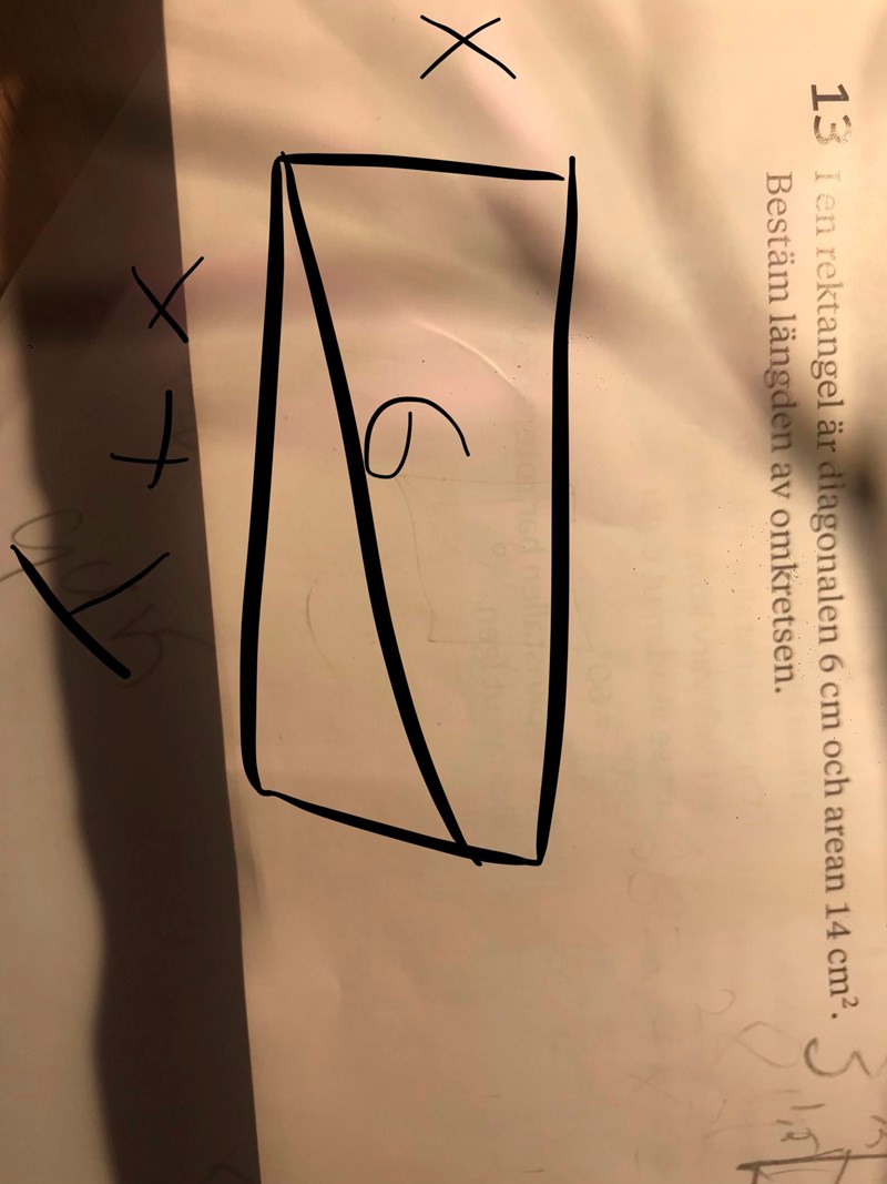 Ja, utifrån din bild ser du ju att diagonalen bildar en rätvinklig triangel (detta kan man konstatera eftersom alla vinklar i en rektangel är 90 grader). Diagonalen, eller hypotenusan är 6 cm. Hur tar du reda på x respektive y?