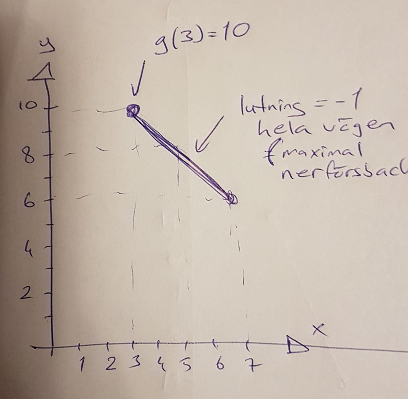 Fast det är inte bara g'(7) g'(7) som ska vara -1. Utan ju mindre g'(x) g'(x) är desto mer avtar funktionen (om g'(x) < 0 dvs), om den ska avta så mycket det  bara går så ska det alltså gälla att g'(x)=-1 g'(x) = -1 för alla x mellan 3 och 7.