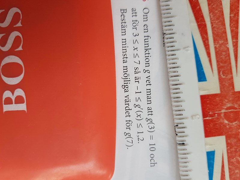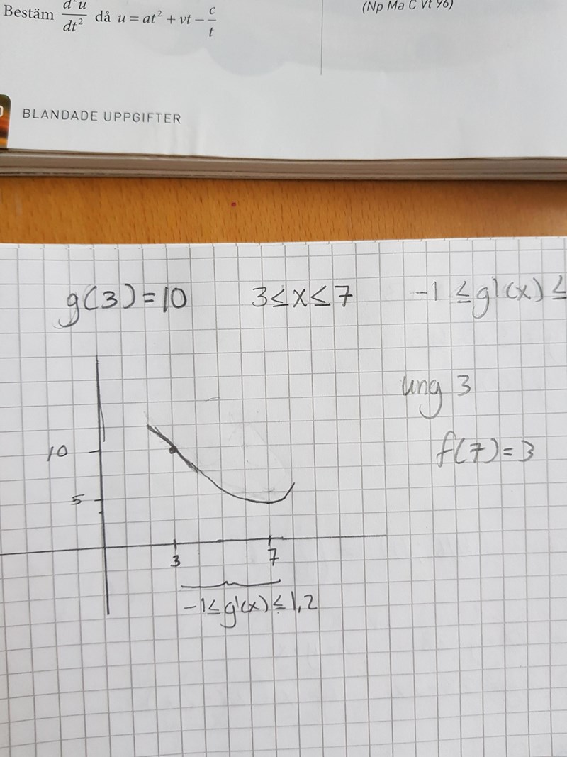 Jaha så när det står så så behöver jag inte använda alla g'(x) för alla värden jag kan använda det minsta för alla värden mellan 3 och 7. Nu förstår jag vad uppgiften vill tack så mycket för hjälpen :)