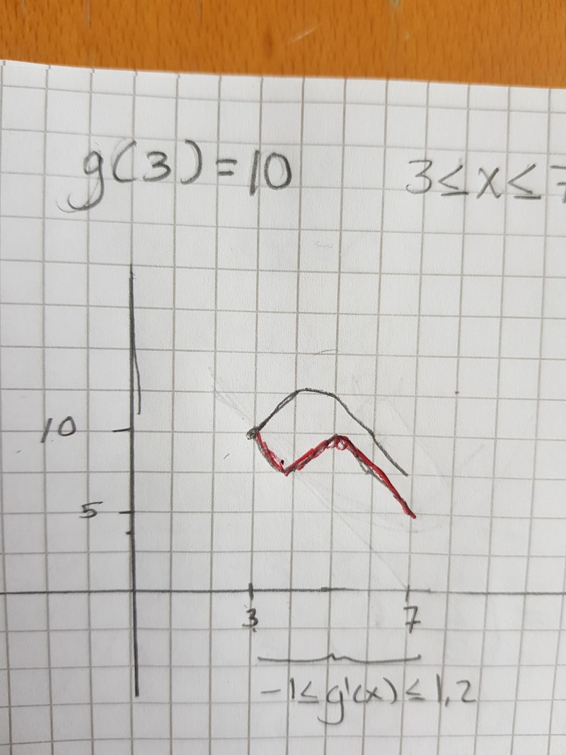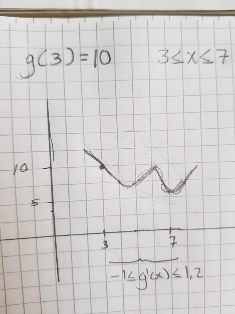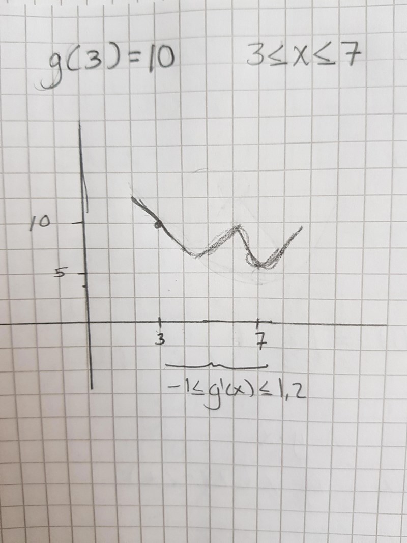 Du får rita kurvan hur du vill, bara du uppfyller villkoren att g(3) = 10 och att g'(x) ligger mellan -1 och 1,2 i intervallet.