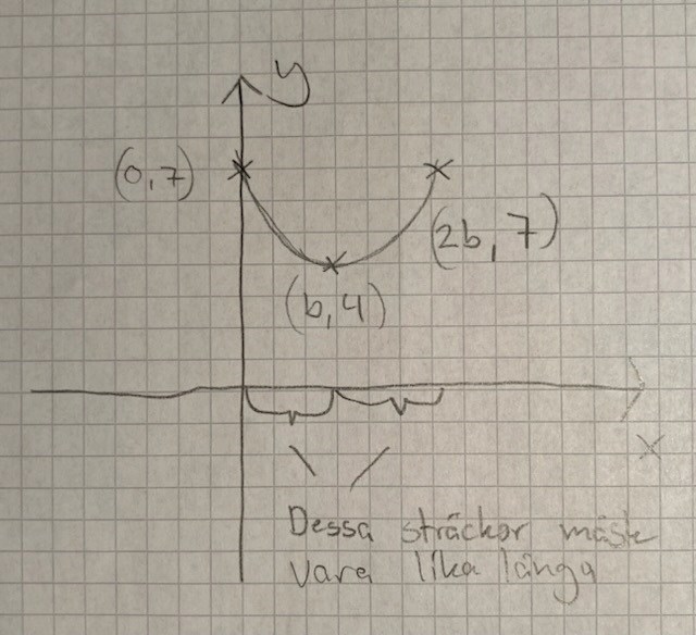 Du vet också vad funktionen har för värde när x=0, eftersom man kan beräkna att f(0)=7. Eftersom grafen till en andragradsfunktion är symmetrisk kring vertex måste det finnas en punkt till där y-värdet är 7. Men vad har den punkten för x-värde? Jo, det måste vara 2b, på grund av symmetrin. Då vet du att f(2b)=7, och det ger dig en ekvation till. Ställ upp dem och lös för a och b.
