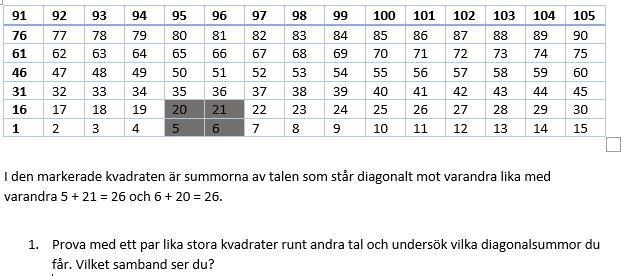 Uppgiften är lite otydlig. Det står inget om en formel, men det finns samband mellan summorna av diagonalerna.