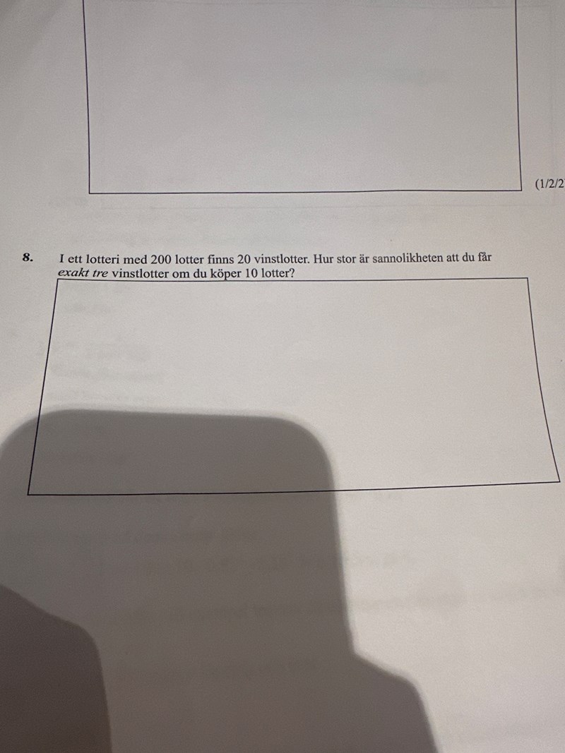 hej! Hur gör man på fråga 8. Jag trodde jag skulle ta kombinationen c( 10,3) delat med c(200,20) men jag fick inte rätt svar . Rätt svar i facit är 5,5 %