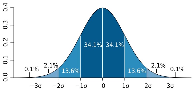 Ett alternativ är att kolla på en typisk kurva för normalfördelning som följer 68-95-99.7-regeln som nedan: