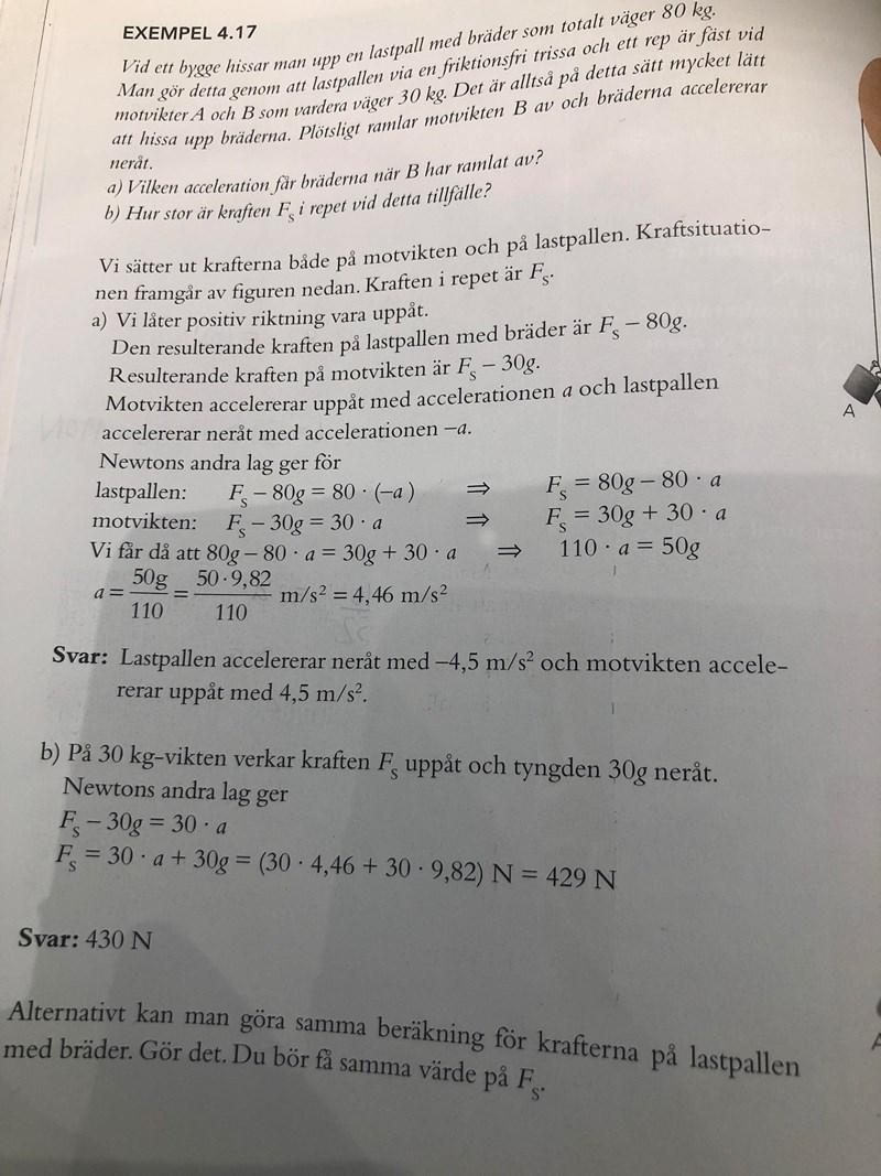 Man har förklarat det på raderna ovanför. Den resulterande kraften på lastpallen med bräder är Fs-80 g, där Fs är kraften i repet. Lastpallen accelererar neråt med accelerationen -a. Detta gör att kraften på lastpallen (med bräder) är F = ma = -80a. Detta är två olika sätt att beskriva samma kraft, så de båda uttrycken är lika. Det gäller ungefär likadant för motvikten också.