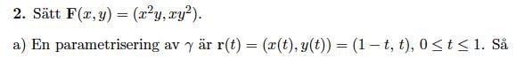 Du kan klara dig utan parametrisering, om jag tänker rätt. Om du ersätter y i x2yx^2y respektive xy2xy^2 med 1-x har du bara en variabel kvar. Tänk på att räkna om dy!