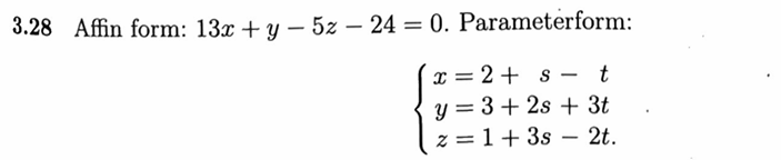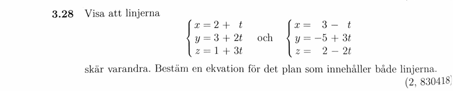 Sedan är det lätt att ställa upp parameterformen för planet. Tag någon punkt i planet och addera de 2 vektorer (riktningsvekt. för de 2 linjerna) till punkten.