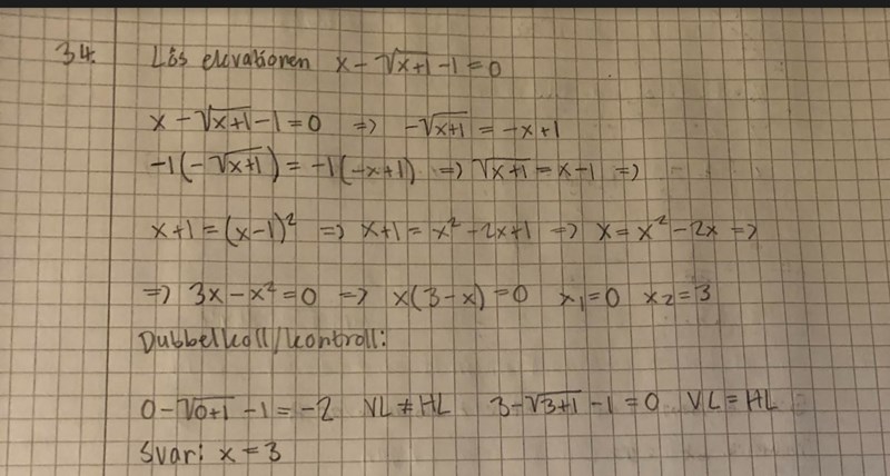 Vilket ger två lösningar. Eftersom vi kvadrerat ett rotuttryck måste vi dock testa båda lösningarna, för att kontrollera att inga falska rötter har uppkommit. :)
