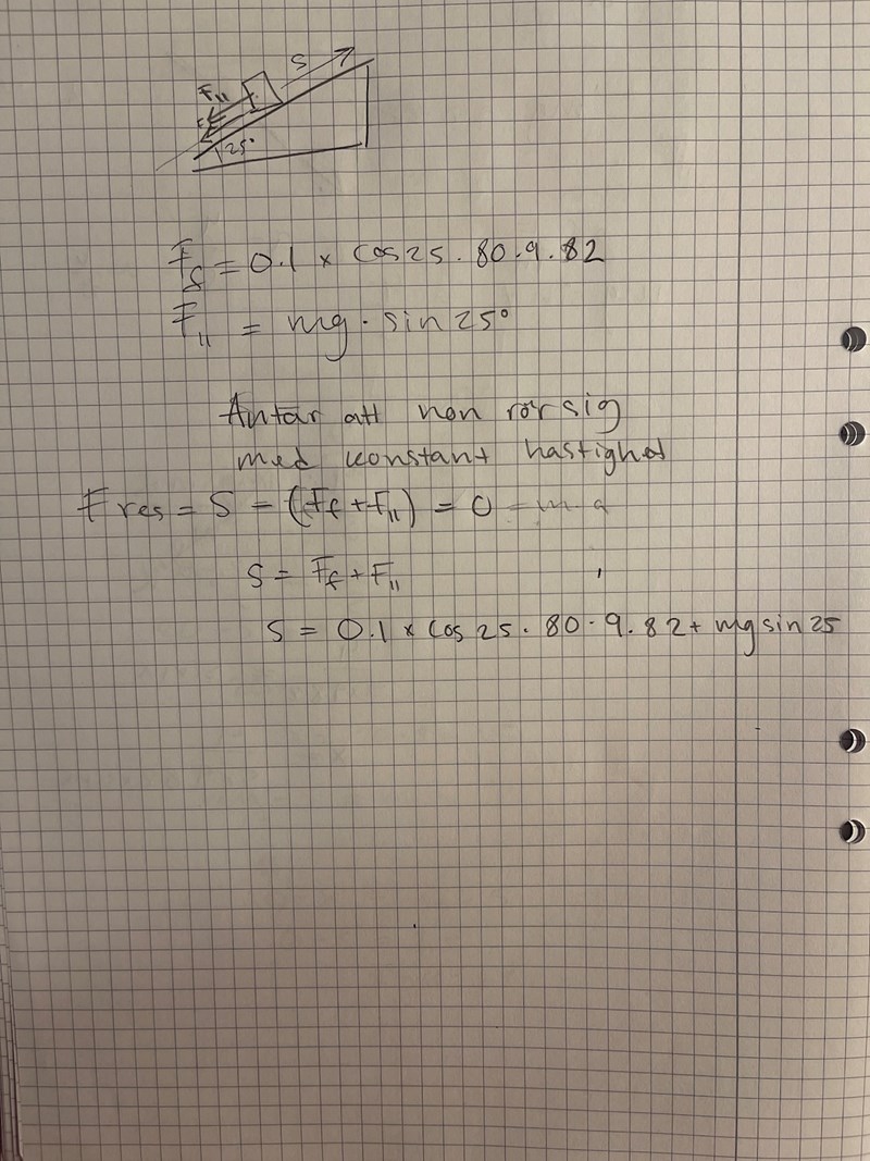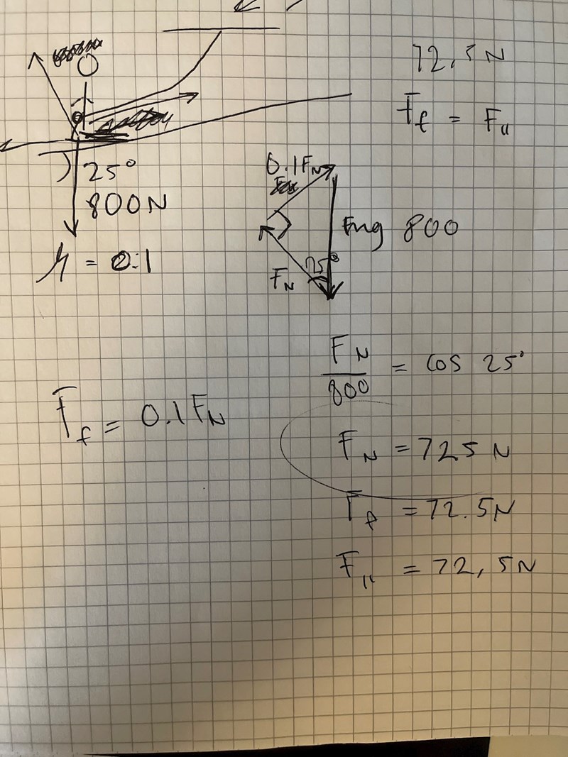 jag fick alltså att normalkraften var 725N, friktionskraften var 72.5N och tyngdkraften 800N( vår lärare låter oss avrunda g till 10)