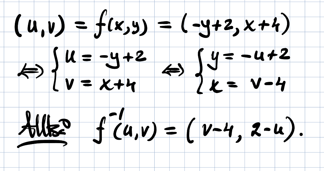 Hej, hur hittar jag inversen funktionen f((x,y))=(-y+2, x+4) ?