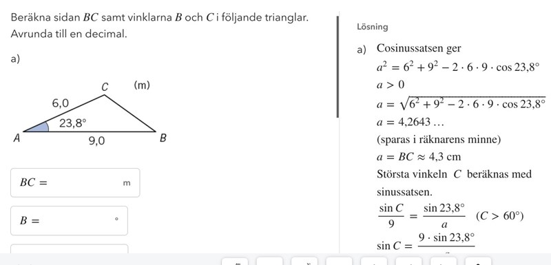 T.ex. i denna uppgift så är deffenitionsmängden C>60 grader. Enligt lösningen så räknar de sedan ut vad C är och får att C = 58.4 grader, men tyligen så duger inte värdet eftersom C ligger "Mot den största sidan" och därför får den största vinkeln och måste vara över 60 grader (enligt def-mängd). Men då tänkte jag att vi säger att C= 61 grader och enligt uppgiften är A = 23,8 grader. För att få B så subtraherar man dessa två grader med 180 grader och får B = 95,2 grader.