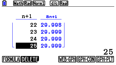Man "trappstegar sig fram" på detta sättet och du ser att trappstegen trycks ihop mellan den gula och den blå grafen. Den konvergerar mot 30.