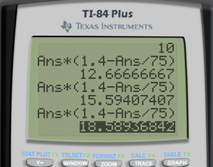 Alternativt kan man använda sig av geogebra, där man definierar f(p) = p * (1.4 - p / 75), d.v.s. formeln på högerledet kallas för f(p). Sedan kan talföljden tas fram m.h.a. kommandot Iterationslista(f, 10, 25) som tillämpar formeln f(p) totalt 25 gånger, med startvärdet 10. På så sätt kommer geogebra spotta ut en lista med .