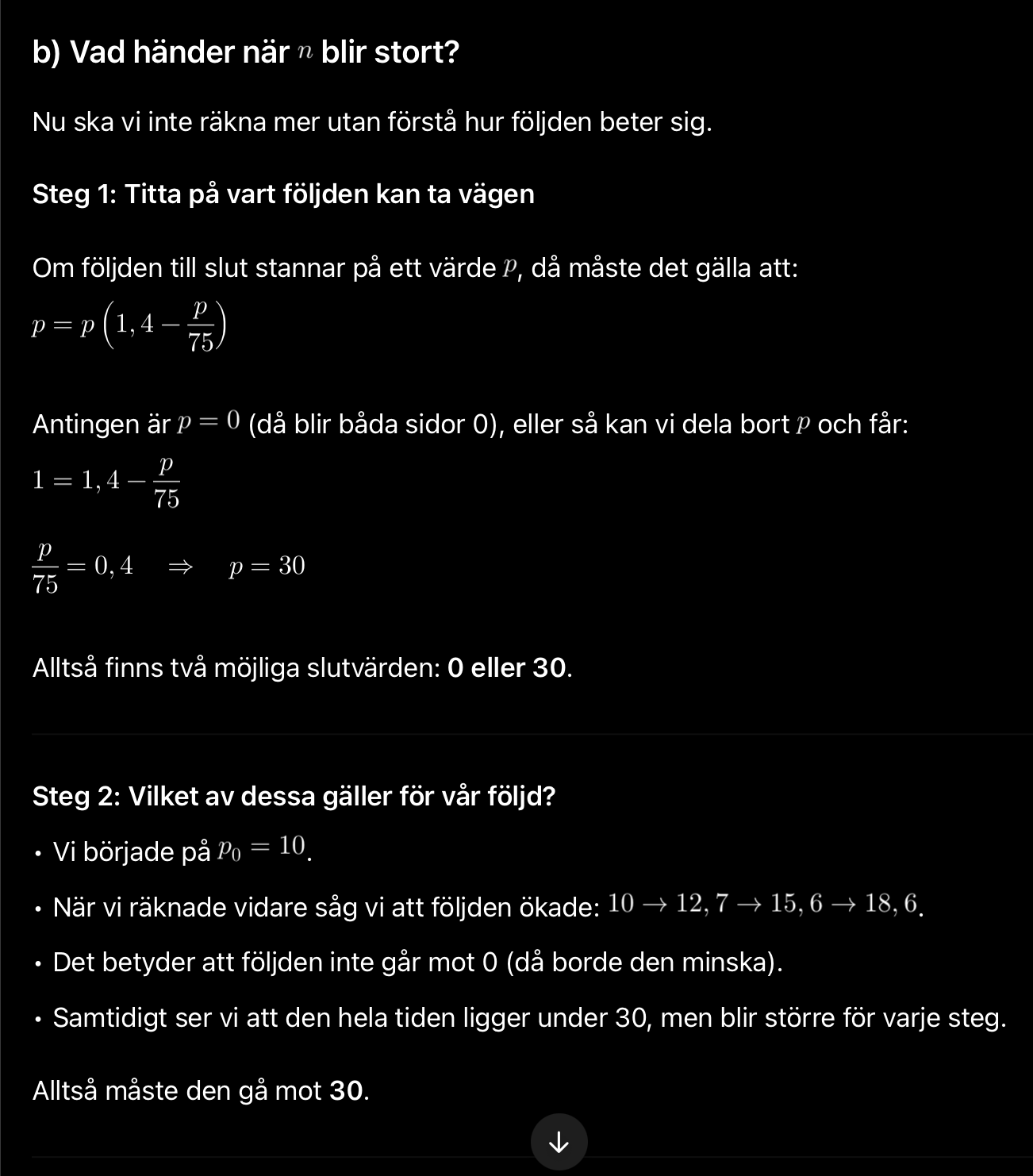 I rekursionssambandet kan man undersöka högerledet. Det är ett andragradspolynom i variabeln vars största värde är 36.75. Det innebär att högerledet aldrig kommer att överstiga talet 36.75.