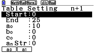 Tryck nu på F5 för att ställa in rekursionen. Start = första n-värde, End=sista n-värde som beräknas, (begynnelsevillkoret). Bekräfta inställningarna m.h.a. knappen EXE