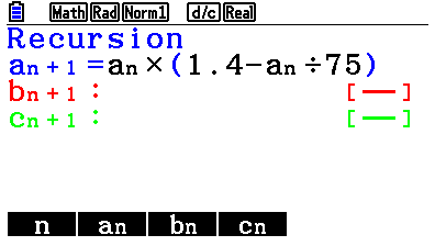 Det borde stå på första raden. Om inte, så tryck F3 för att ändra typ och sedan F2 för att välja . Tryck på kursortangenten till höger för att börja skriva rekursiv formel och mata in formeln och bekräfta formeln med knappen EXE.