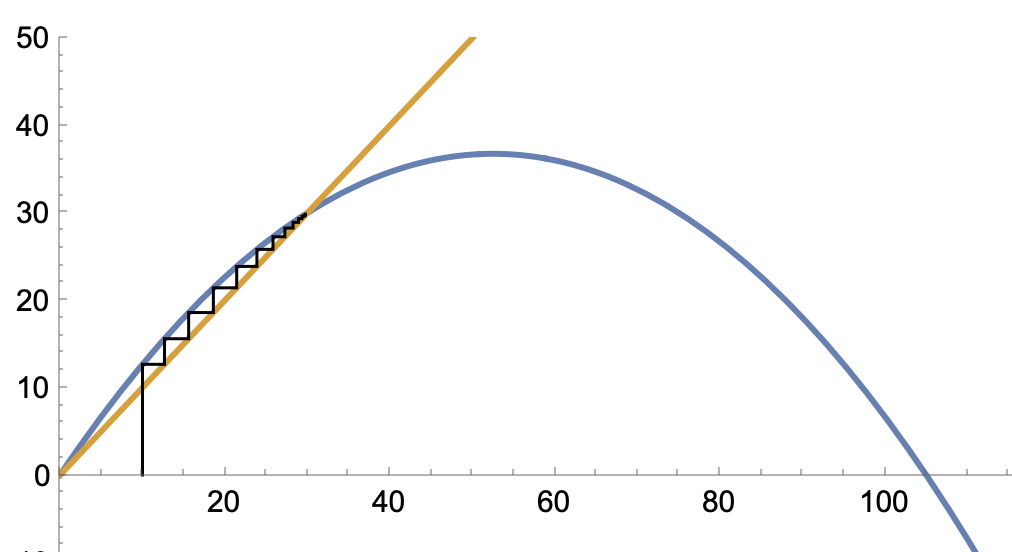 Om vi har p0=10 så blir p1=12.6667 och vi går horisontellt ut mot linjen y=x, och sedan rakt upp mot grafen för att finna p2=15.5941, och sedan ut mot y=x för att finna p3=18.5894 osv.