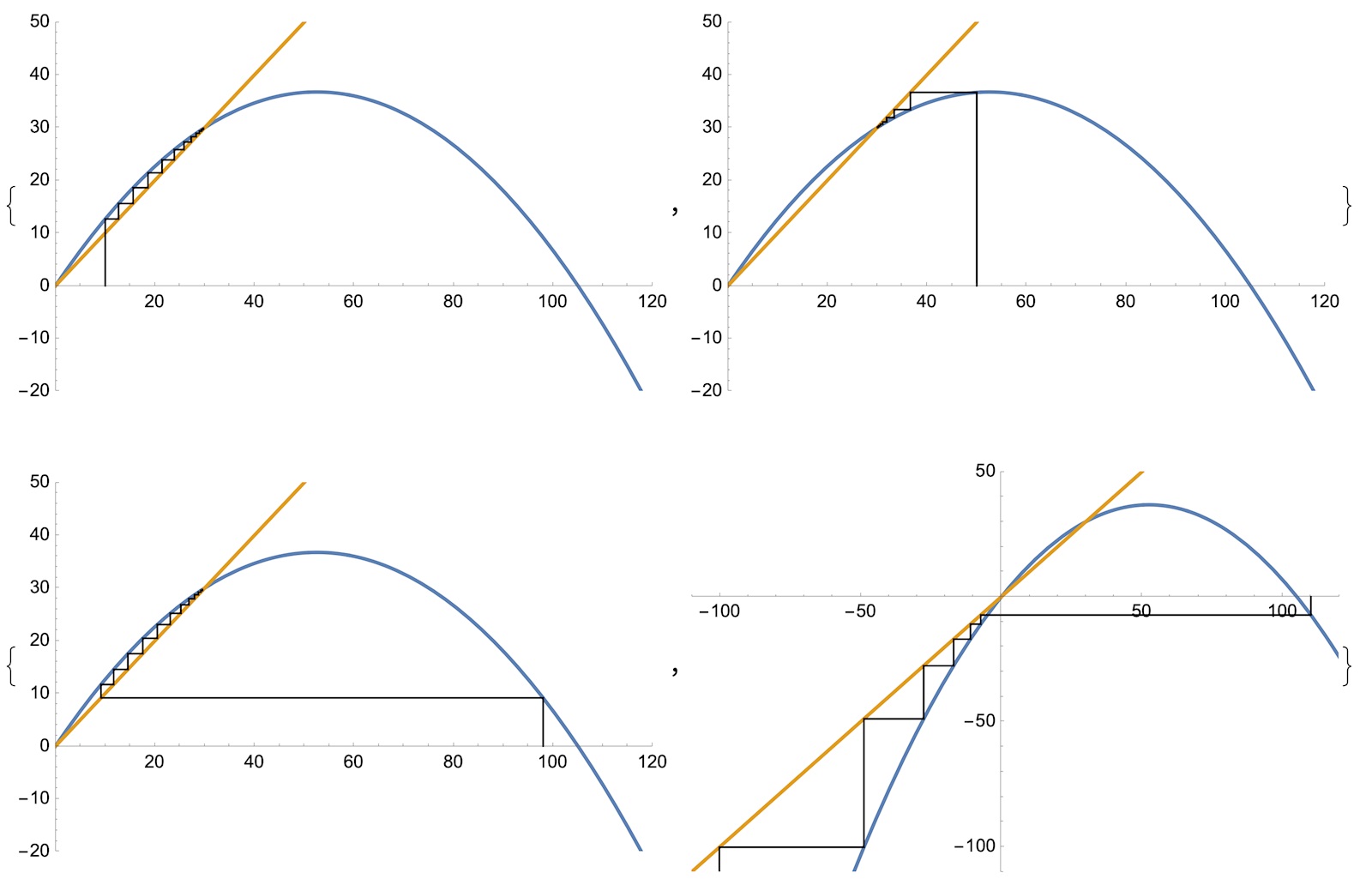 Genom att välja andra startvärden p0 fås andra "trappor" (se ovan) och den del divergerar, som i den 4:e bilden.