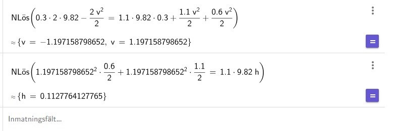 Tänk också på att den höjd du får ut i steg två ska adderas till höjden som klotet redan är på vid steg ett, dvs 0.3m.