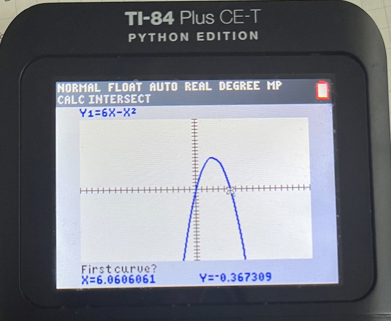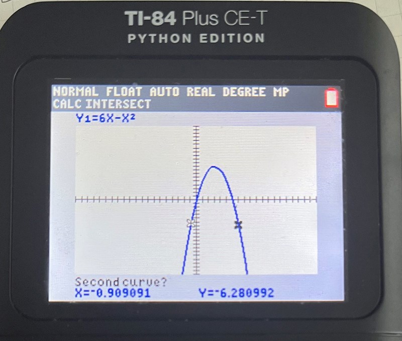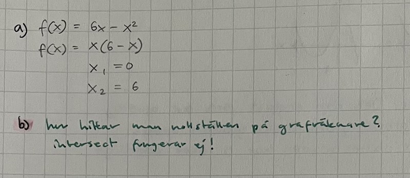 Nedan har jag löst denna funktions nollställen algebraiskt. Nu så ska jag göra det grafiskt så jag började med att rita upp grafen på min räknare och tryckte sedan på ”2nd” och sedan ”trace” och sist ”intersect” (se bilderna nedan hur jag gör steg för steg) som jag brukar göra när jag vill ta reda på vart grafen skär i x axeln (d.v.s, nollställena), men den här gången fungerar inte det. Varför då? Hur ska jag göra istället?