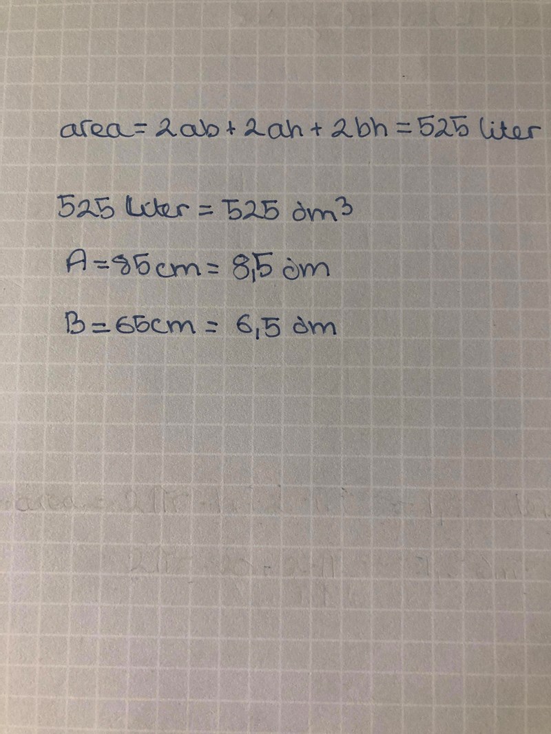Vi vet att längden är 8,5 dm och att bredden är 6,5 dm, och så kallar vi höjden för h. Sätter i in allt i formeln för volymen får vi