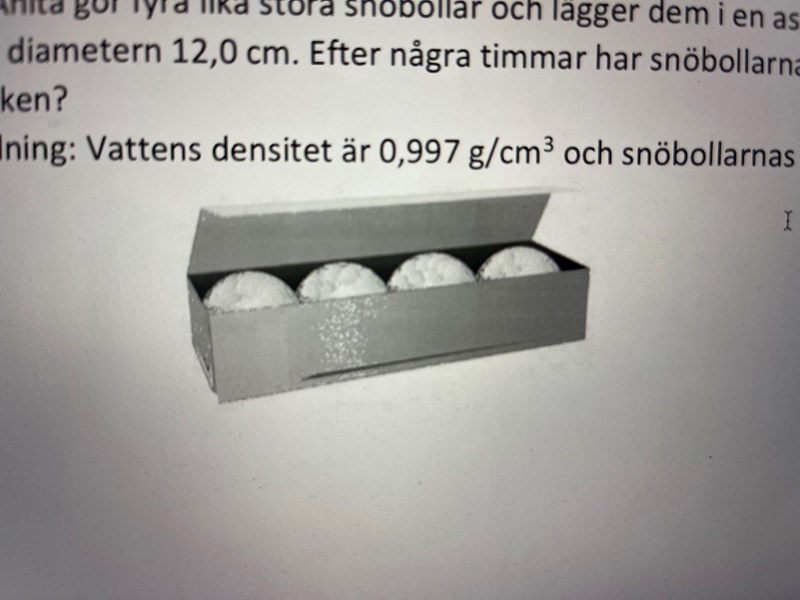 Anita gör fyra lika stora snöbollar och lägger dem i en ask där de precis ryms. Varje snöboll har diametern 12,0 cm. Efter några timmar har snöbollarna smält. Hur hög är vattennivån då i asken?