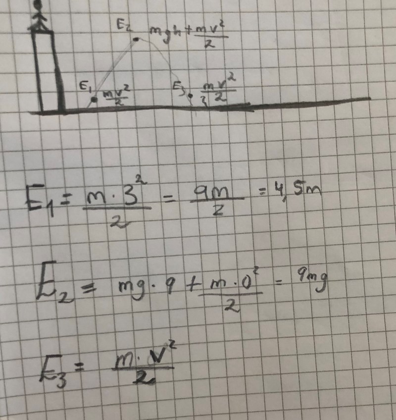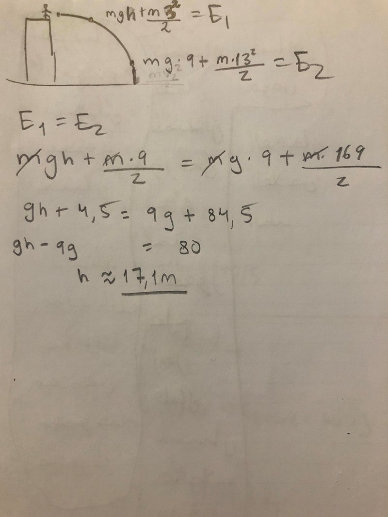 En person står högt upp i ett hus och kastar en boll med hastigheten 3 m/s. När bollen är 9,0 m över marken har den hastigheten 13 m/s. Hur högt är huset?