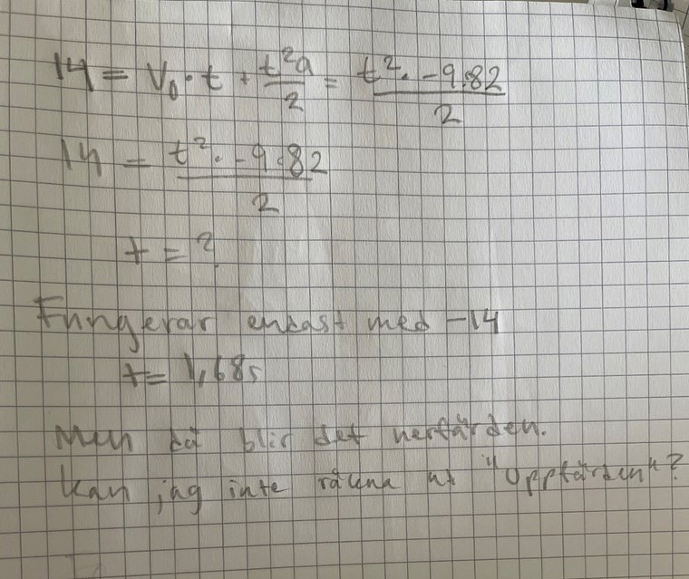 1. Eftersom att tyngdaccelerationen använder sig av formen m/s2 och inte endast s så tror jag inte att man kan dela 14 för att få ut tiden men jag är inte helt säker.