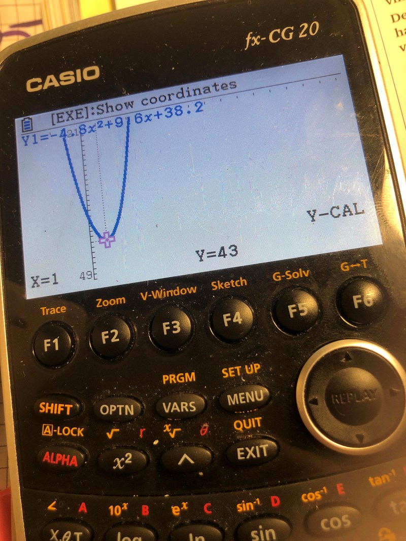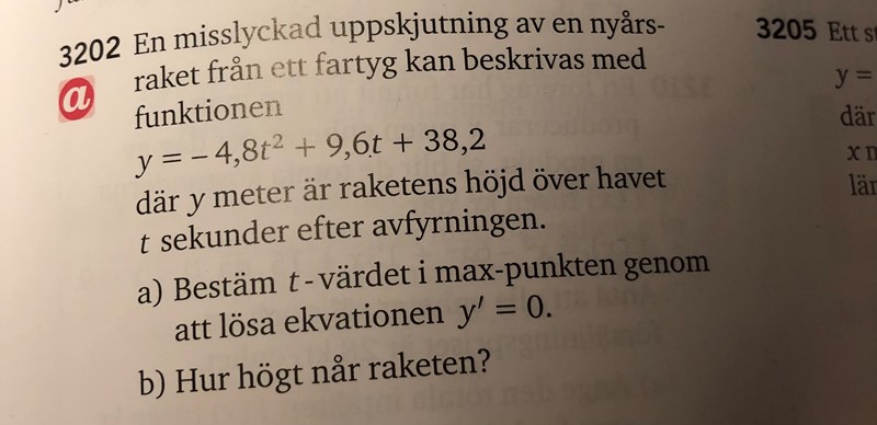 Du bör kunna se på formeln y = -4,8t2+9,6+38,2 att funktionen har en maximipunkt bara genom att se att det är en andragradsfunktion med en negativ koefficient för kvadrattermen.