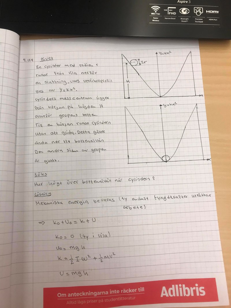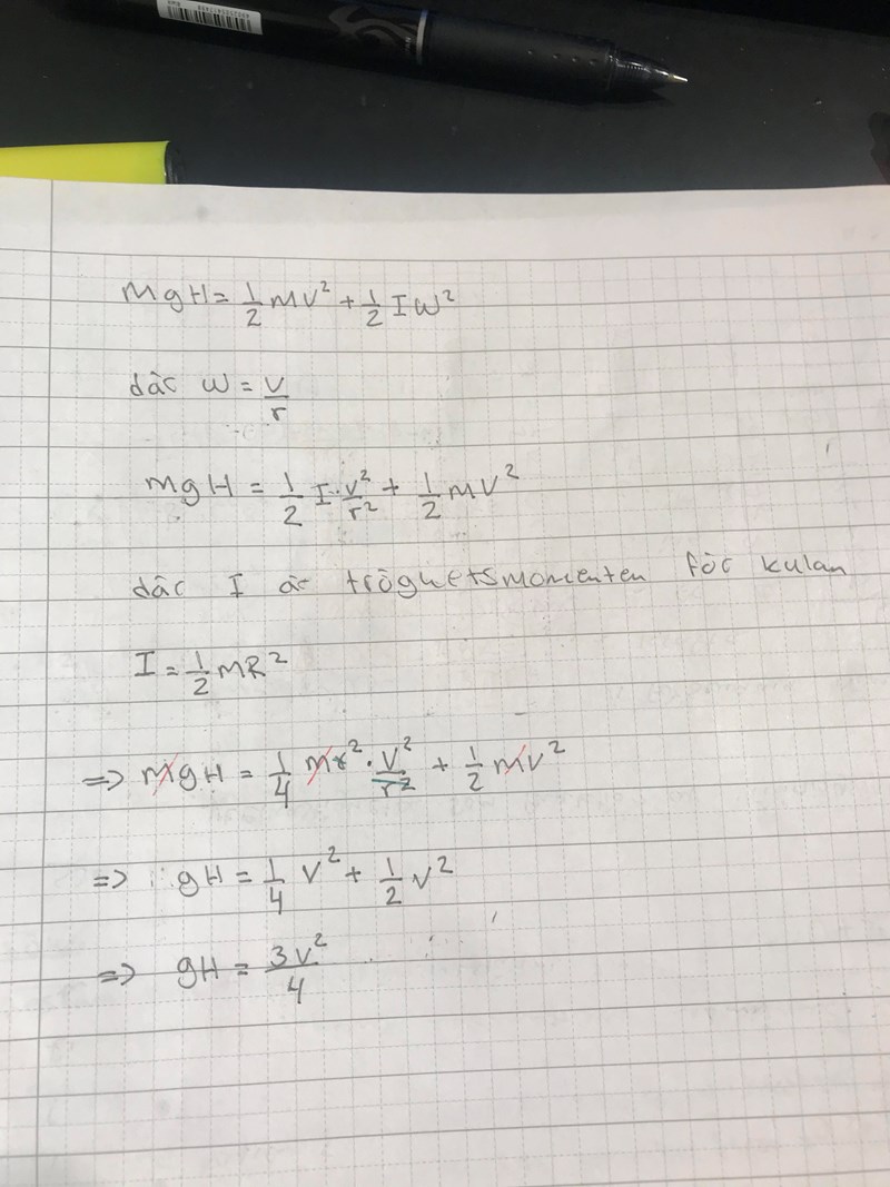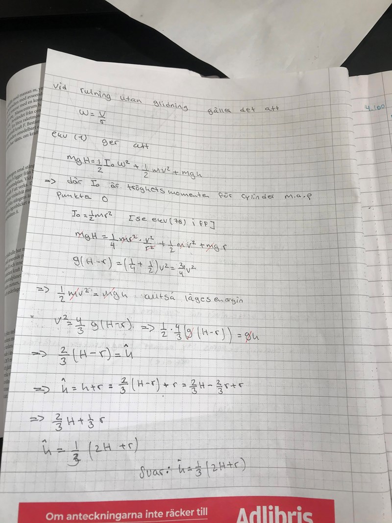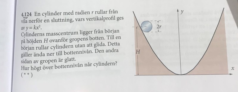 Vad blir då den totala rörelseenergin (translation + rotation) på botten? Uttryck I i m och r.