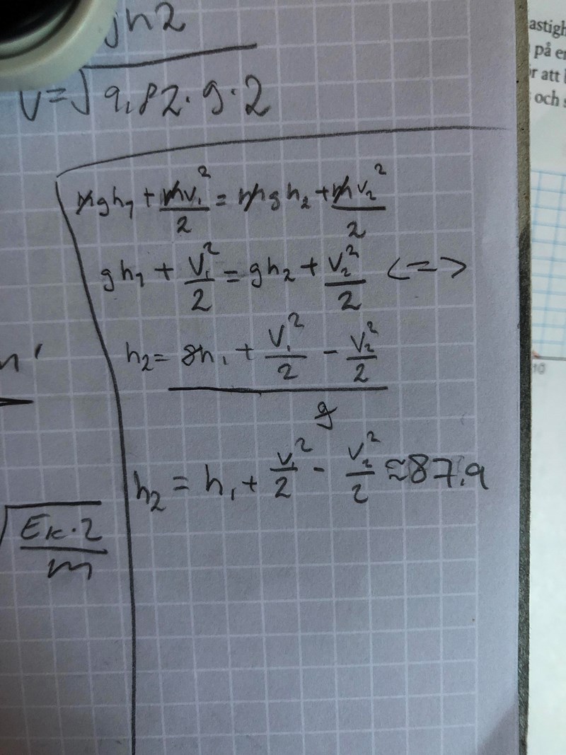 När du har h2= (plussa ihop detta)/9,82 så tror jag att du får rätt svar
