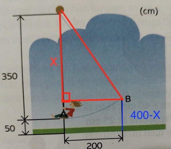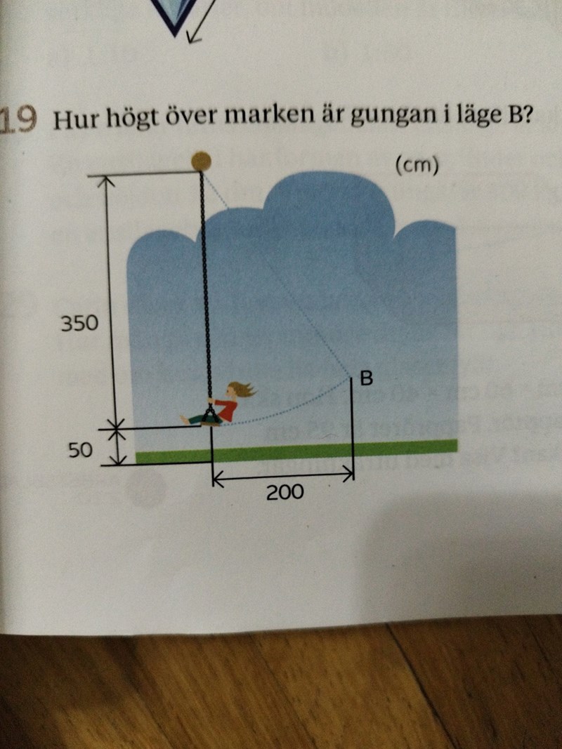 Nja, om du tittar på bilden av triangeln jag ritat i #6 så är det hypotenusan som är 350. Det är ju för att repet ALLTID är lika långt oavsett hur högt upp gungan svingas.. se #2