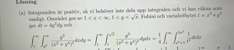 Om du tittar på integralernas gränser så ser du att x går från y2 till oändligheten och att y går från 1 till oändligheten.