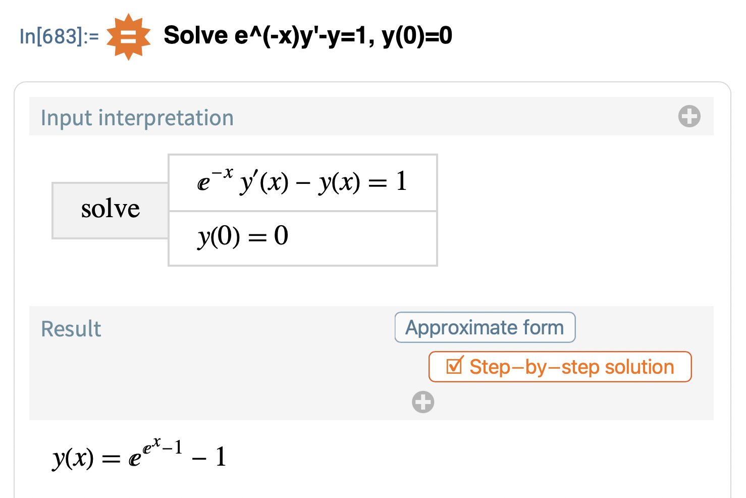 (e^-x)y’(x)-y(x)=1, y(0)=0. Jag får sedan att I.F blir e^(-e^x) men sen måste jag integrera denna för att få vad y(x) är.