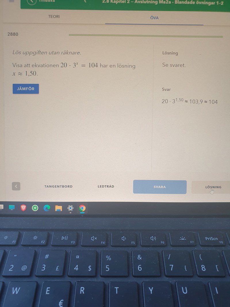 Pröva 31,5=31+0,5=31·30,5=333^{1,5}=3^{1+0,5}=3^1\cdot3^{0,5}=3\sqrt{3}