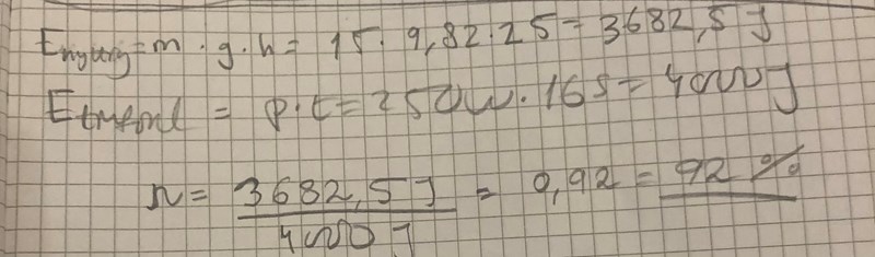 såsom rubriken lyder , hur kan man avgöra om 250W är nyttig eller tillförd effekt? Jag gissade på att det var nyttig effekt för det är det som användes, jag använde mig av formeln E=P*t för att räkna ut energin. Med Formeln mgh räknade jag ut tillförda energin. Men svaret blir inte rätt.