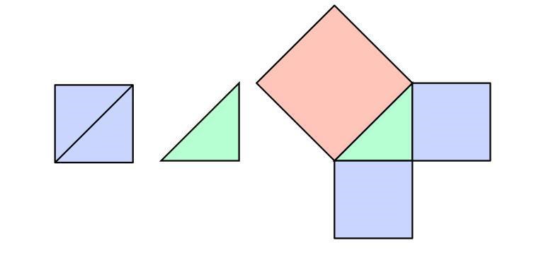 Det kan vara trevligt att ha i bakhuvudet att Pythagoras sats just kan tolkas som ett påstående om area och inte bara ett påstående om sidor. Dvs att att en kvadrat med lika lång sida som hypotenusan har lika stor area som den sammanlagda arean av två kvadrater med katererna som sidor.