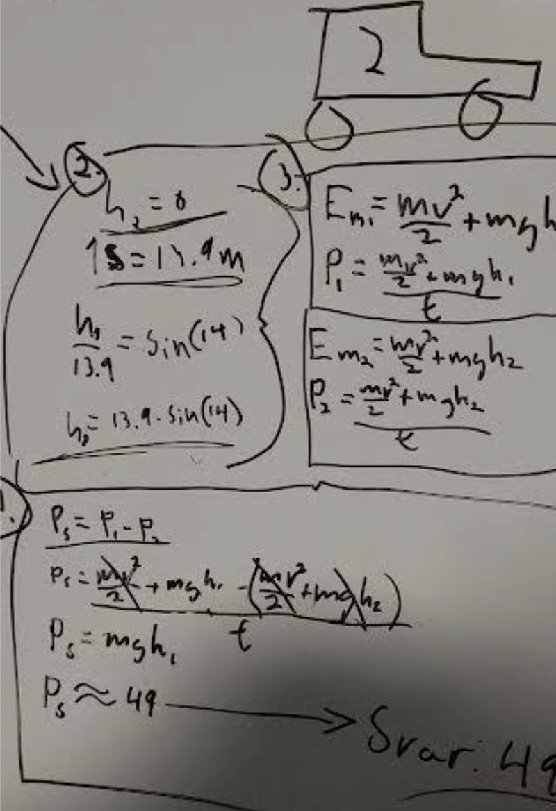Det betyder att bilen varje sekund lyfts h=503,6·sin(14°)h=\frac{50}{3,6}\cdot\sin(14^{\circ}) meter uppåt.